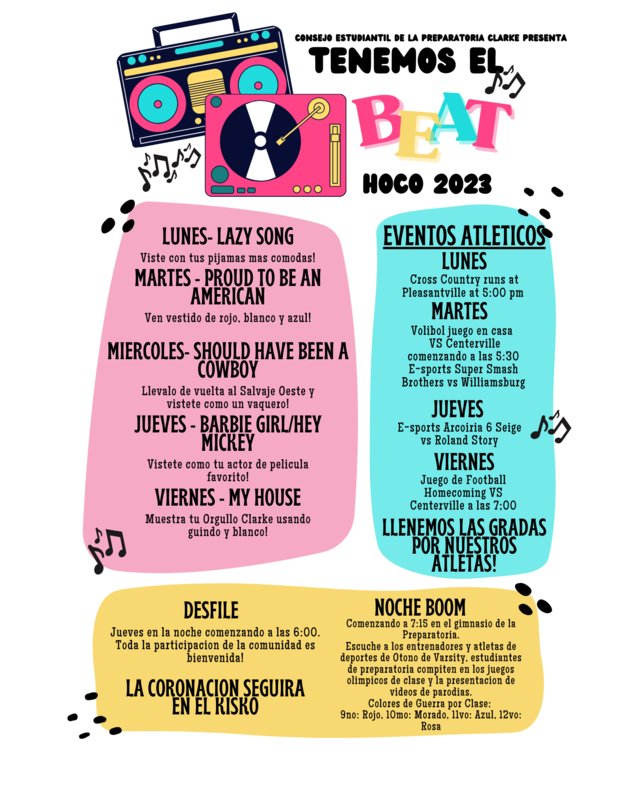 ¿Estás listo para el Homecoming (Regreso a Casa)? Por favor, consulte nuestra Guía de Homecomingo (Regreso a Casa) de la comunidad para obtener toda la información que desee saber sobre Clarke Homecoming 2023, incluidos los días de vestimenta escolar, el desfile de Regreso a Casa y la información sobre la coronación, detalles de baile y más.