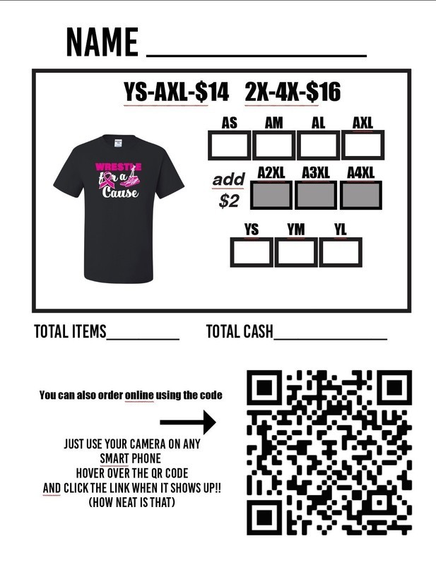 The Middle School Wrestling T-shirt fundraiser for breast cancer in honor of Cris McAfee, Christie Stortenbecker, and Nicki Andrew deadline is this coming Monday Nov. 29th.