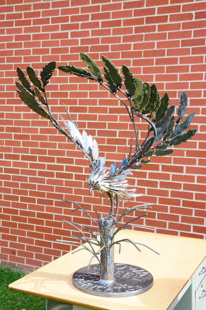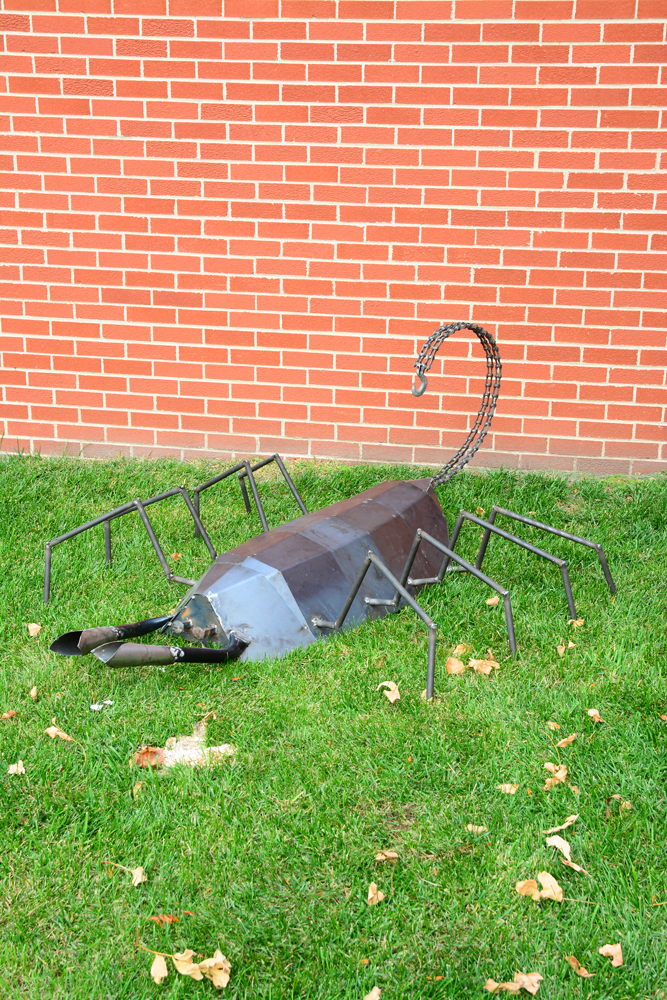 Materials used for the competition ranged from miscellaneous manufacturing scrap to donated sheets of metal, rebar, steel rods and even some discarded ironing boards and found elements. From there, five teams of students and their mentors brought together the pieces, cut, ground, bent, welded, and sculpted pieces of art ranging from an elegant hawk in flight to multi-piece nature scenes as well as a frightening tank-like scorpion.
